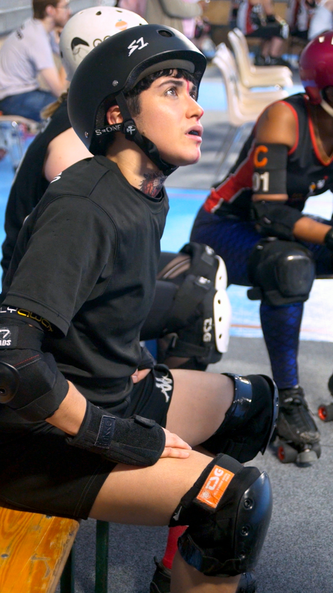 À travers le regard de Camille Ducellier, ce portrait d’une identité rebelle en constante évolution se double d’une découverte du Roller Derby, sport musclé à roulettes encore méconnu en France. Popularisé sur grand écran par l’électrisant Bliss de Drew Barrymore, le derby voit deux équipes de patineurs ou patineuses s’affronter lors d’une compétition mêlant vitesse et brutalité (maîtrisée). Qu’il ait fait l’objet d’un double choix (par Jasmin comme activité sportive et par Ducellier comme centre d’attention) est évidemment signifiant. Le derby sort des clous, loin des autres sports éminemment plus sérieux. Les compétiteurs ont des alias impertinents (Fouf la rage – Jasmin – y côtoie Tahiti Boobs, Petit Poney et Sexe à piles), et s’affrontent aussi sauvagement qu’ils se respectent, dans une camaraderie dont bien des sports devraient s’inspirer. Le corps, seul outil de la compétition, y est essentiel, soumis à rude épreuve et marqué de bleus, ecchymoses et saignements, comme autant de cicatrices et marques de guerre. Surtout, le roller derby est vecteur d’intégration, particulièrement pour les personnes trans, qui peuvent rejoindre une équipe correspondant non pas à leur sexe, mais au genre dans lequel elles se reconnaissent.